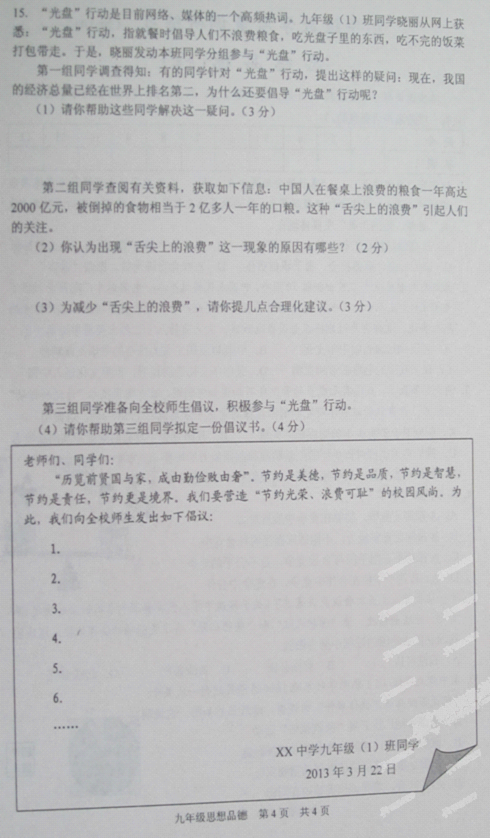 (3)建議國家要制定法律、法規來約束浪費行為;媒體要加大宣傳、曝光力度;公民要自覺發揚勤儉節約美德;餐飲業要合理為顧客提供餐飲服務,提醒顧客不要浪費;有關部門要加強督查等。寫出一點1分,共3分。